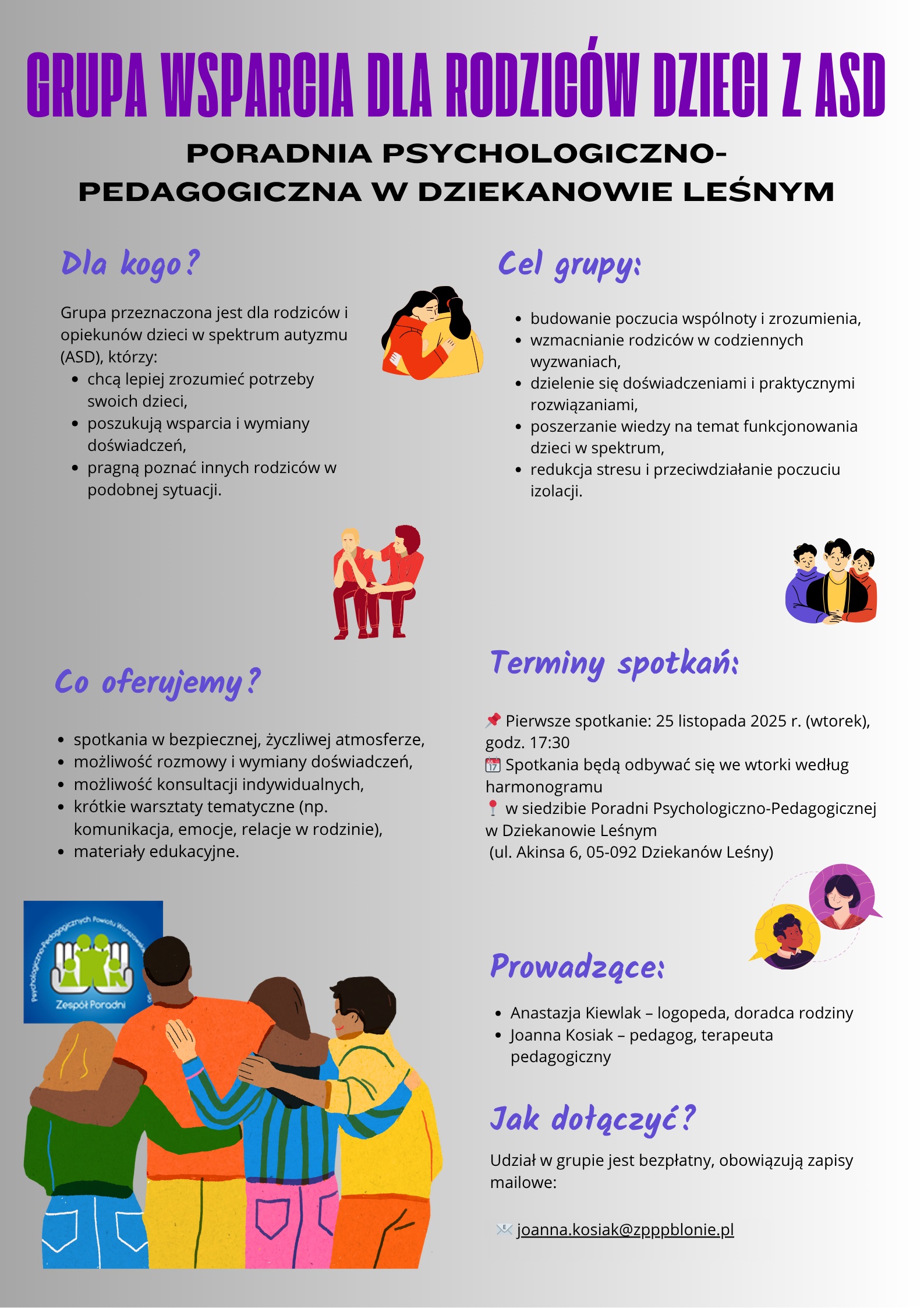 wiemy, jak ważne jest poczucie zrozumienia, wymiana doświadczeń oraz możliwość rozmowy z osobami, które mierzą się z podobnymi wyzwaniami. Dlatego w Poradni Psychologiczno-Pedagogicznej w Dziekanowie Leśnym tworzymy otwartą grupę wsparcia dla rodziców dzieci z ASD — można dołączyć w dowolnym momencie.